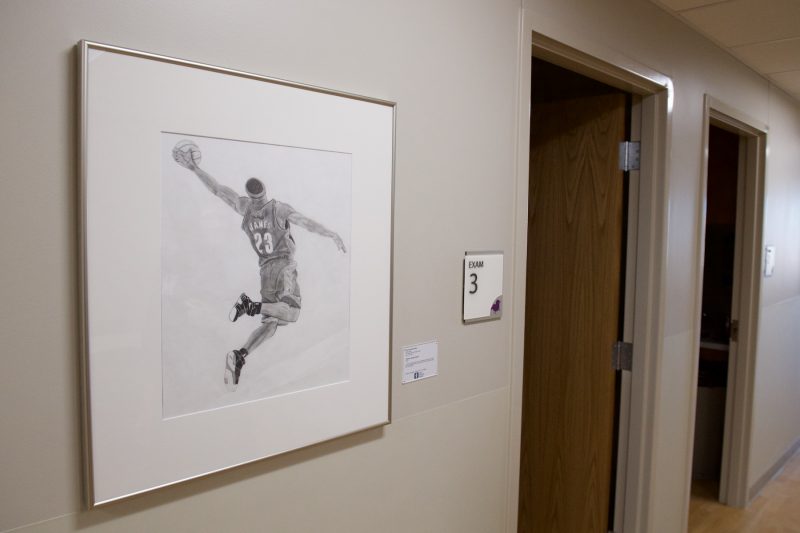 This pencil drawing by Dan Olszewski, 18, from St. Vincent-St. Mary HIgh School, features NBA player and Akronite LeBron James and adorns the wall in the new Sports Rehab office on Level 7.