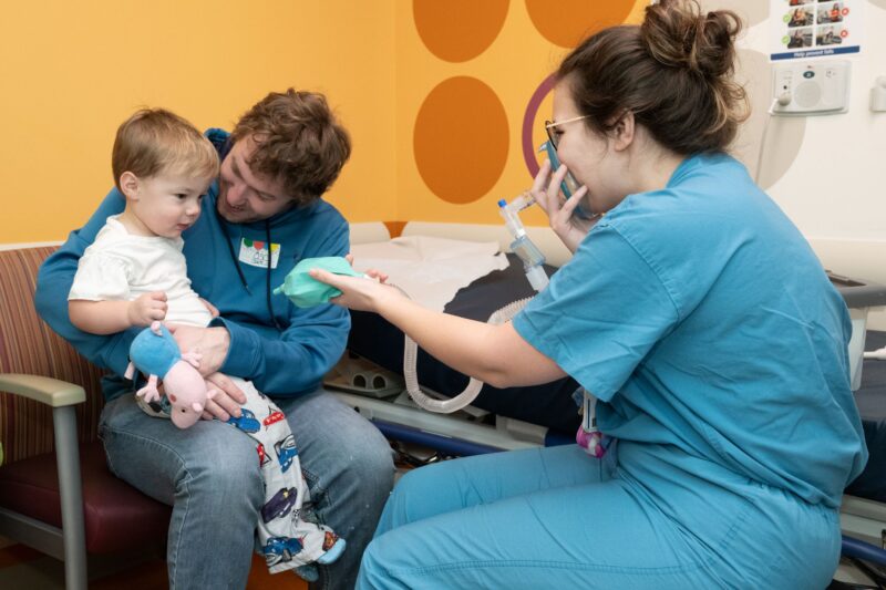 August gets a kick out of practicing putting the mask on his stuffed animal. Abby then shows August how his stuffed animal would fall asleep after breathing into the mask, just like he would be doing soon in the operating room.