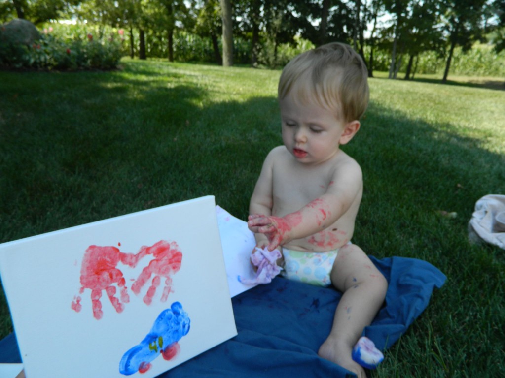 For Randy’s birthday this year, we had our first trial of using finger paint. The little Picasso and I took a trip outside in nothing but a diaper, cloth to sit on, a box of wipes, finger paint, and a small canvas. Our little man ended up with some belly painting. Hiding the evidence from daddy before he opened it on his birthday morning was a challenge.