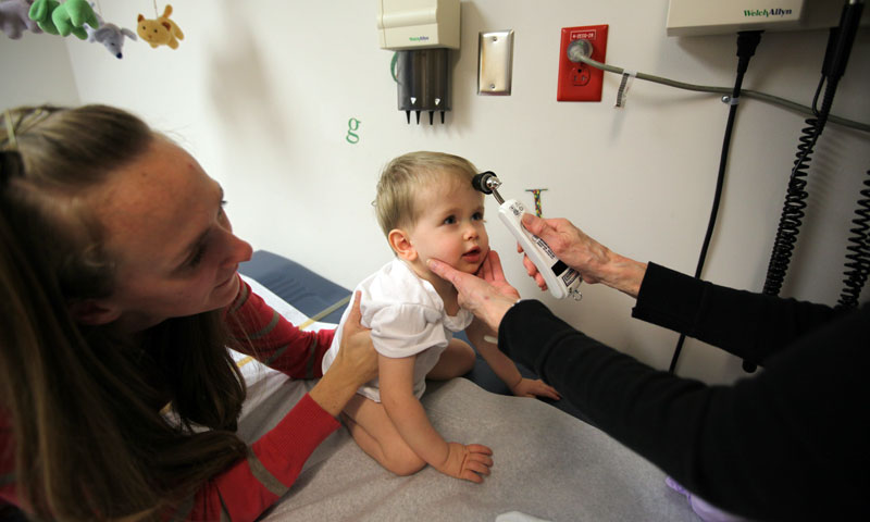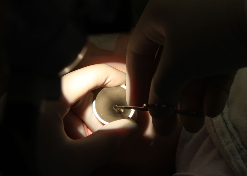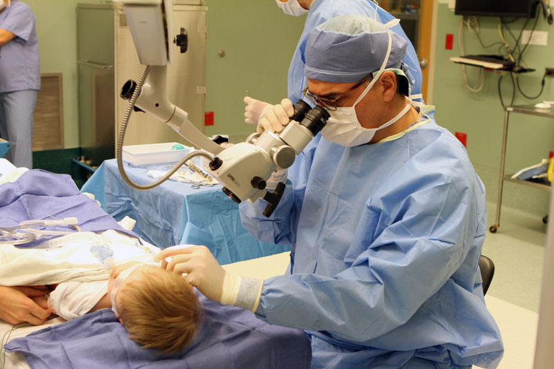 11:06 a.m. Dr. Milo carefully places a tiny, blue tube in Jordan’s eardrum. The tube will allow Jordan’s middle ear to better drain.