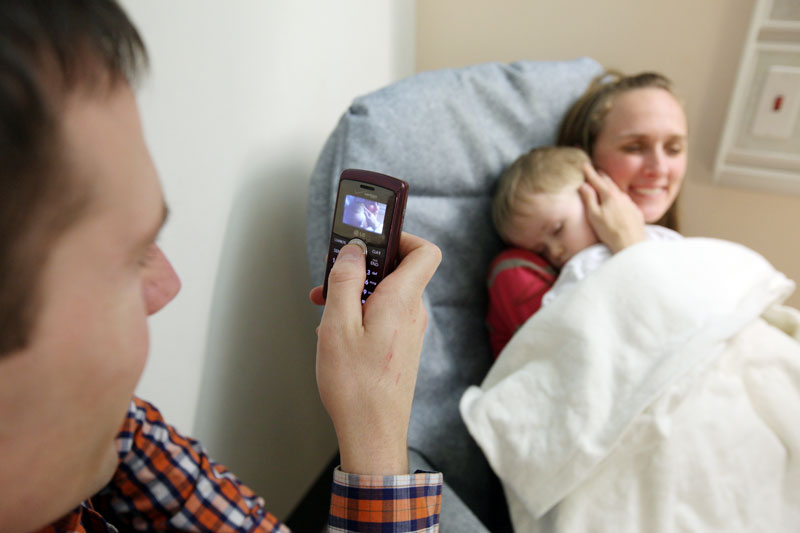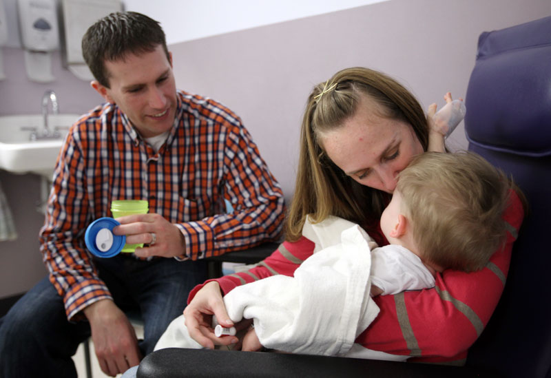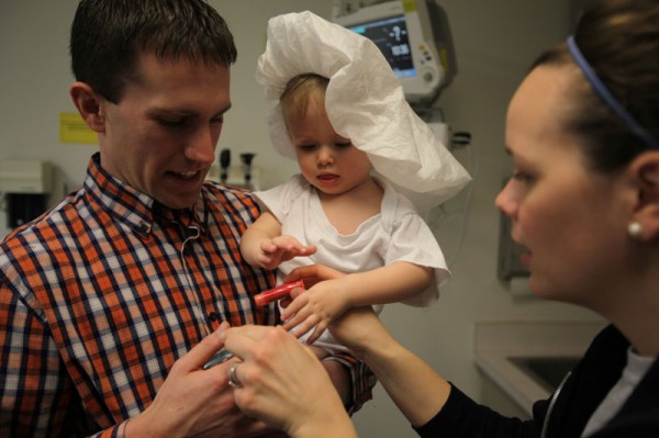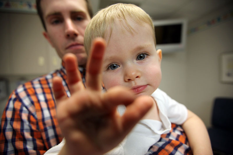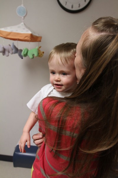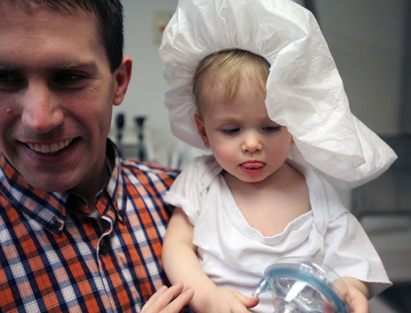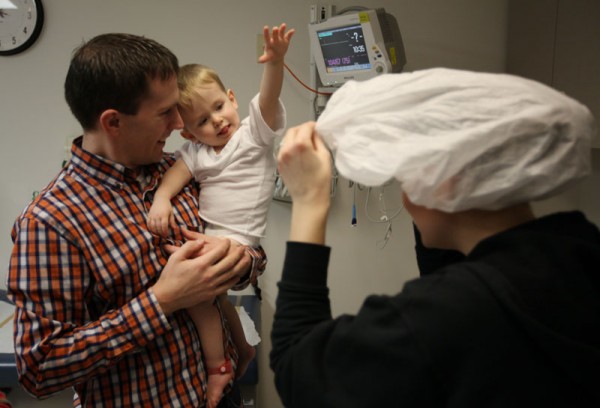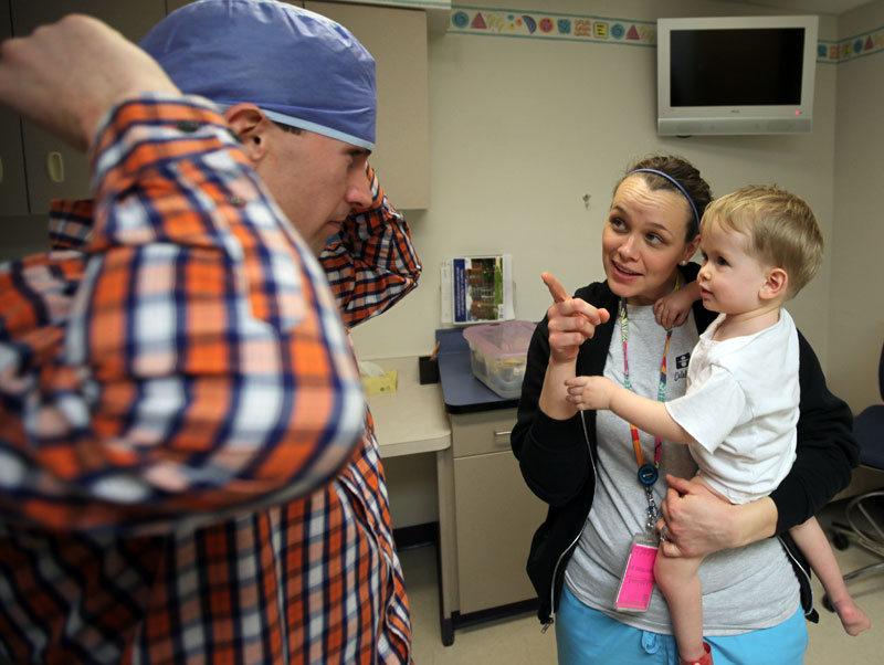 10:38 a.m. Randy ties on a surgical hat while child life specialist Megan Flaker holds Jordan. Child life specialists are important members of the healthcare team who help families cope before, during and after a medical procedure or hospital stay.