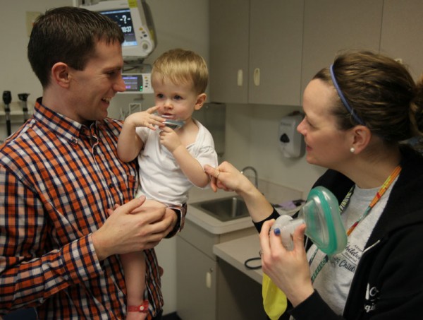 10:40 a.m. Jordan plays with an anesthesia mask with his dad and child life specialist. These types of activities help familiarize children to the sights and sounds of the OR in a secure setting.