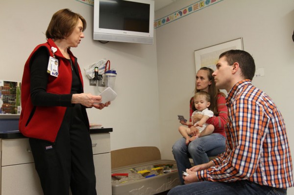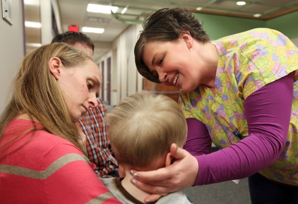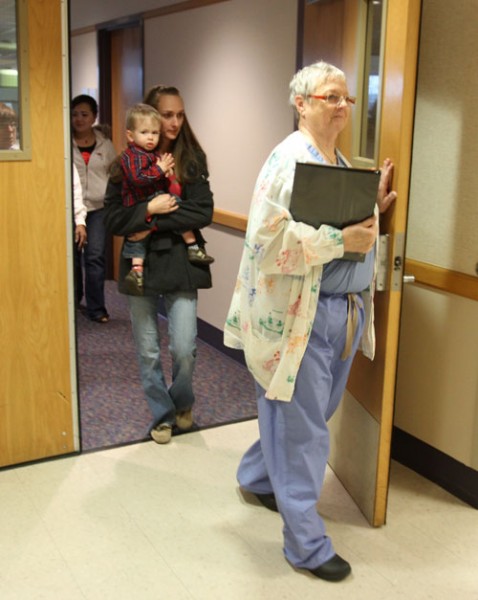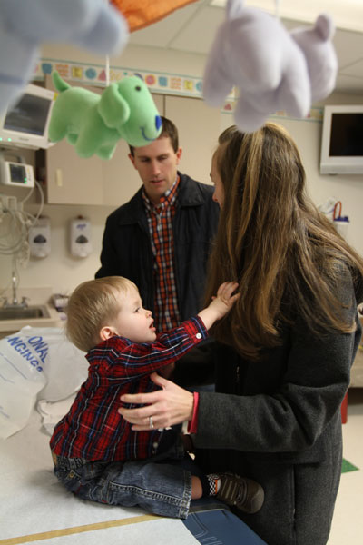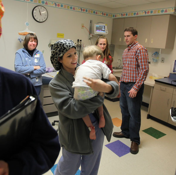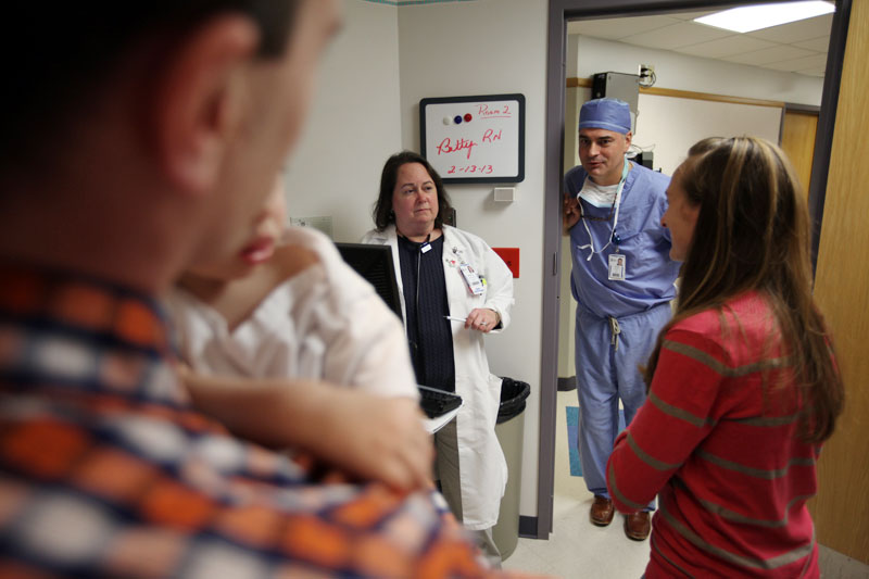 9:40 a.m. Nurse Lynda Stuber, surgery information specialist, takes Jordan and his parents to an exam room for pre-surgery assessment.