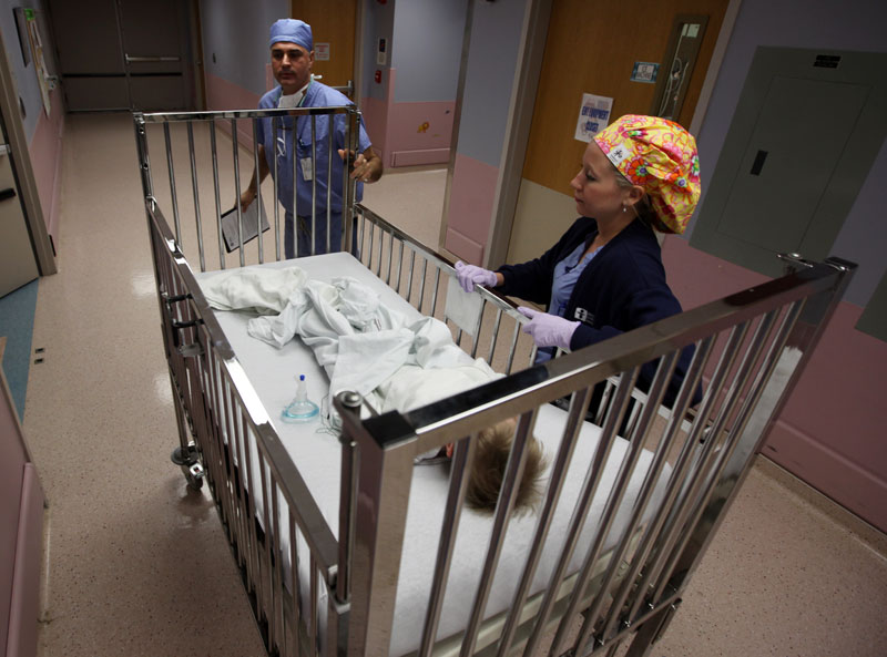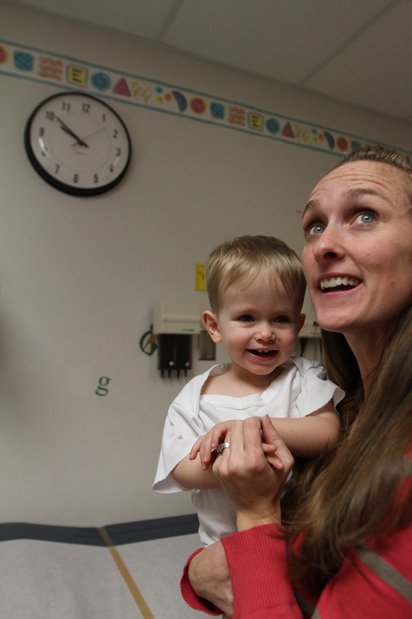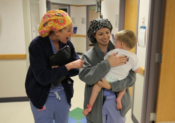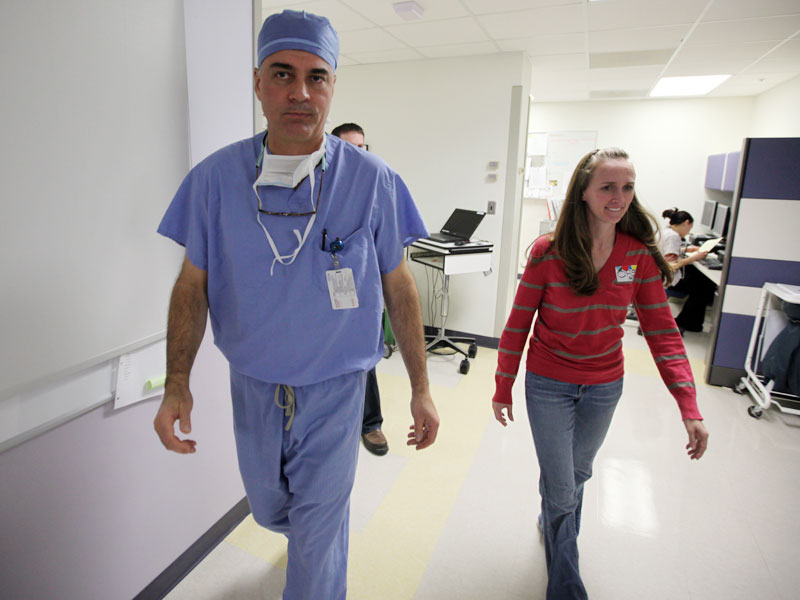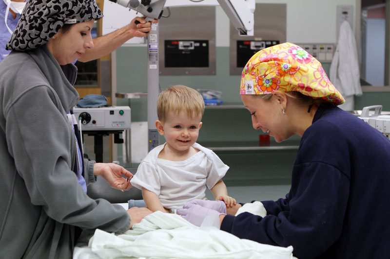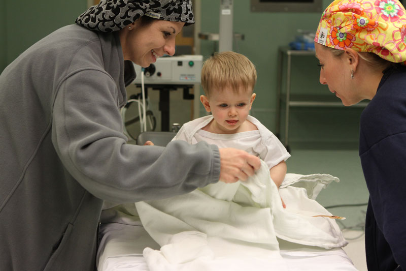 10:58 a.m. Sarah and nurse anesthetist Melanie play with Jordan on their way to the OR.