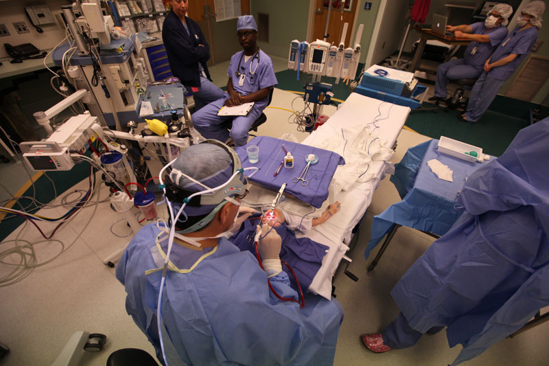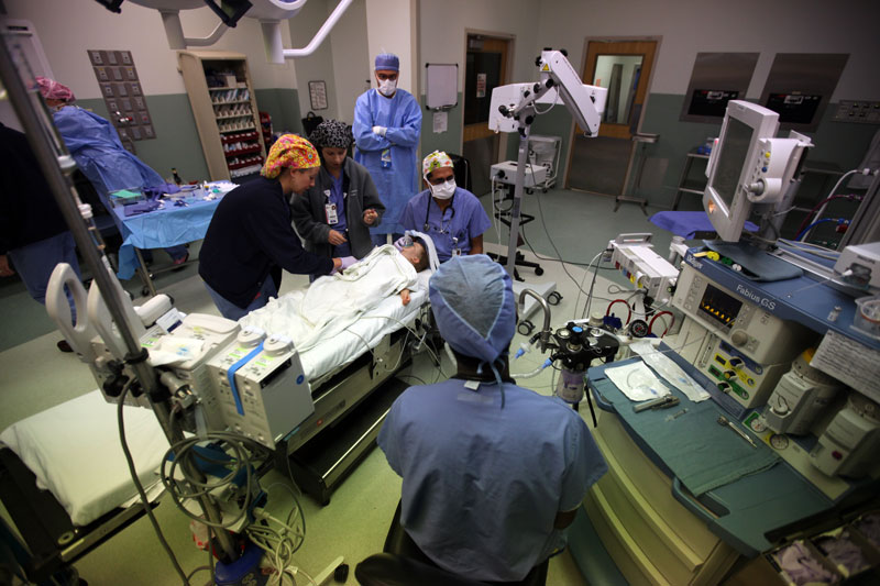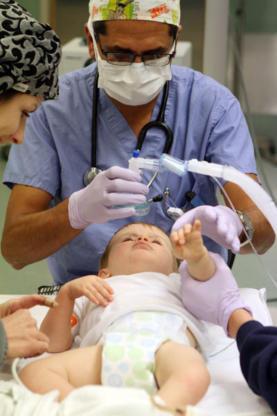 11:00 a.m. Before the surgery can begin, Dr. Farid administers anesthesia to Jordan.