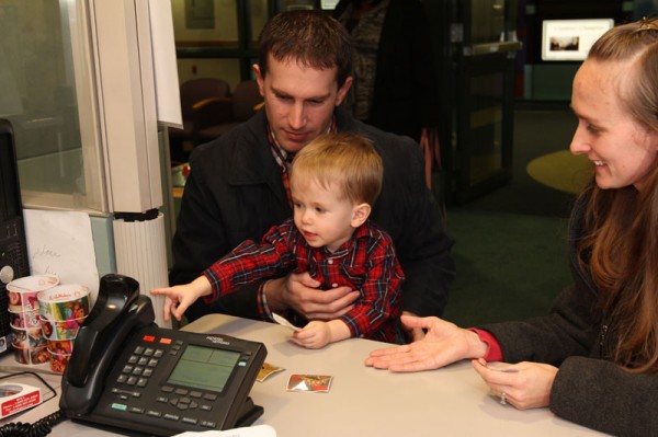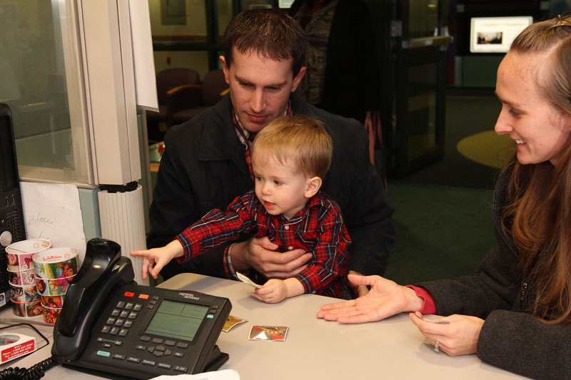 9:30 a.m. First stop – admitting and registration. Jordan spots the stickers at the registration desk. He left with 5 of them.