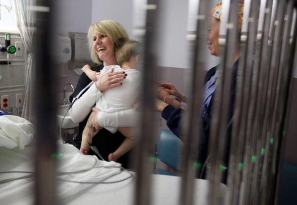 11:27 a.m. Post anesthesia care unit nurse Holly Bauer holds Jordan in recovery.