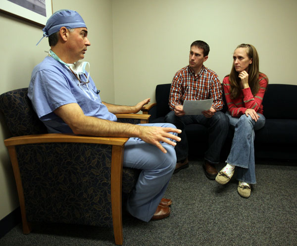 10:50 a.m. Nurse practitioner Michelle Wilson talks to the Pollocks before surgery.