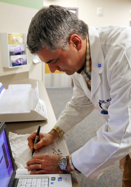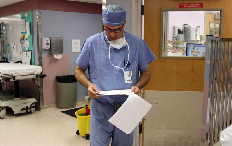 9:57 a.m. Dr. Anton Milo reviews his surgery schedule and notes for the day.