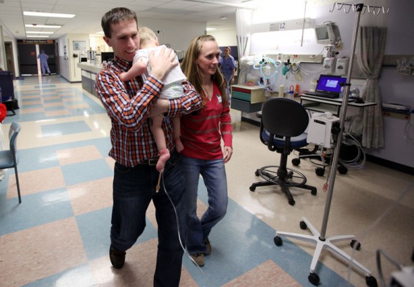 10:58 a.m. Jordan’s parents and his Grandma Tammy Linden say bye and watch as OR nurse Sarah carries him back to the OR.