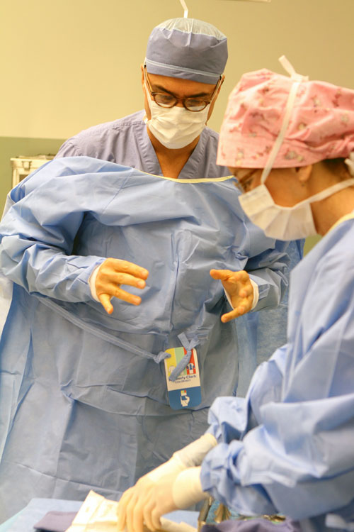 11:01 a.m. Dr. Milo and OR nurse Marilyn Khoury scrub into the OR.