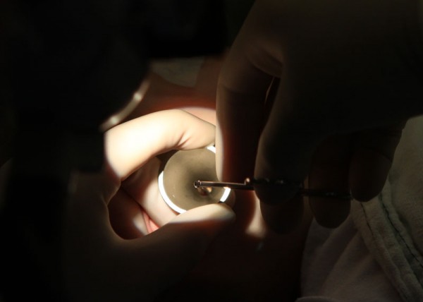 11:08 a.m. Dr. Milo uses a telescope to insert the tiny ear tube. Ear tube surgery is the most common childhood surgery, with more than half a million children having ear tube surgery a year.
