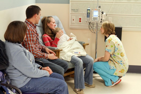 11:51 a.m. Megan and Randy are happy to comfort Jordan in the recovery area.