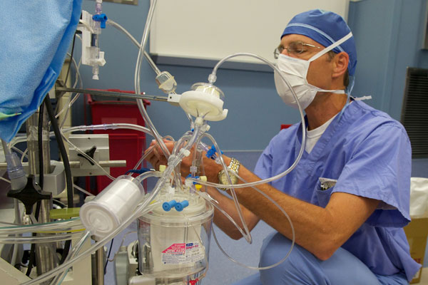 Murray taps the tubing to remove air bubbles and tests the pressure inside for any leaks. He also checks the oxygenator, filters and alarms, and makes sure the heating and cooling units that control the patient’s core body temperature during surgery are in working order.