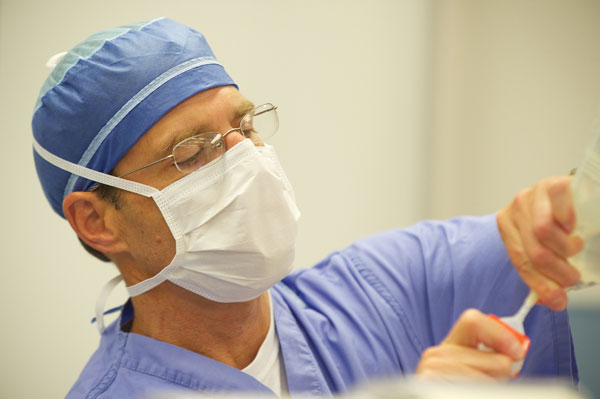 During the 7:30 a.m. huddle, the 9-person surgical team lays out the expectations and possible complications.