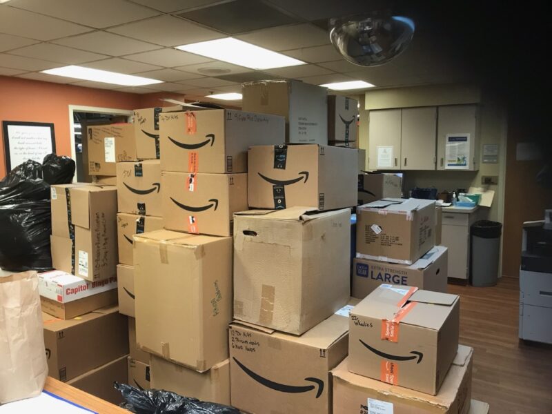 Ashley Natale and Taylor McCarthy lead a big delivery of toys in September, and were greeted by Laura Miller, Gene Walter and Wendy Sawyer from the Volunteer Office.