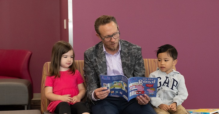 Mark Smucker, chair of the board, president and CEO of The J.M. Smucker Co., reads to Abigail (left) and Ayaan, two Akron Children’s patients.