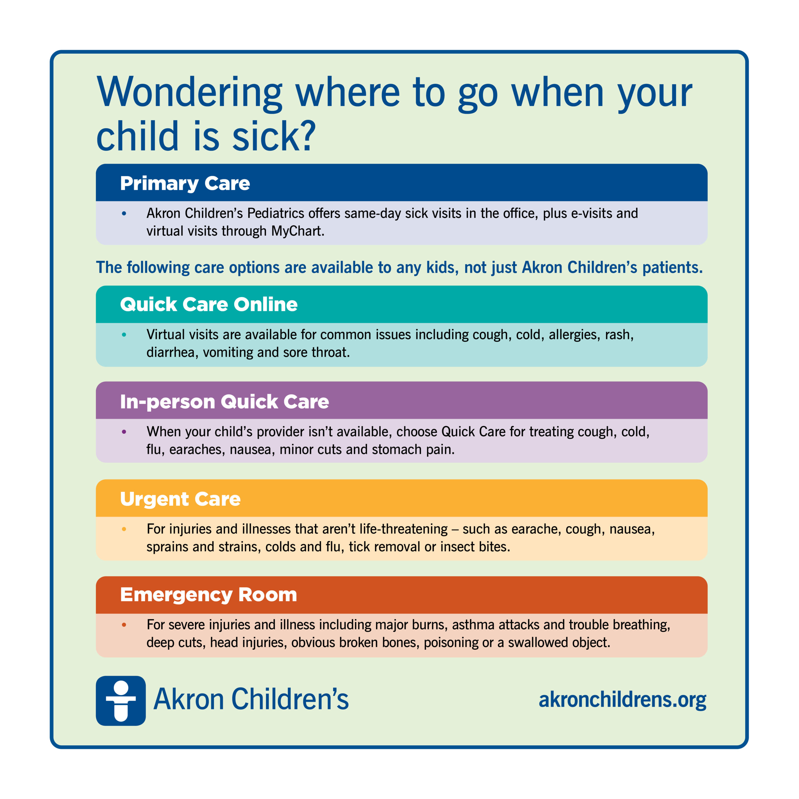 Your child does not have to be a current Akron Children’s patient to use Quick Care, Quick Care Online, Urgent Care or the ER.