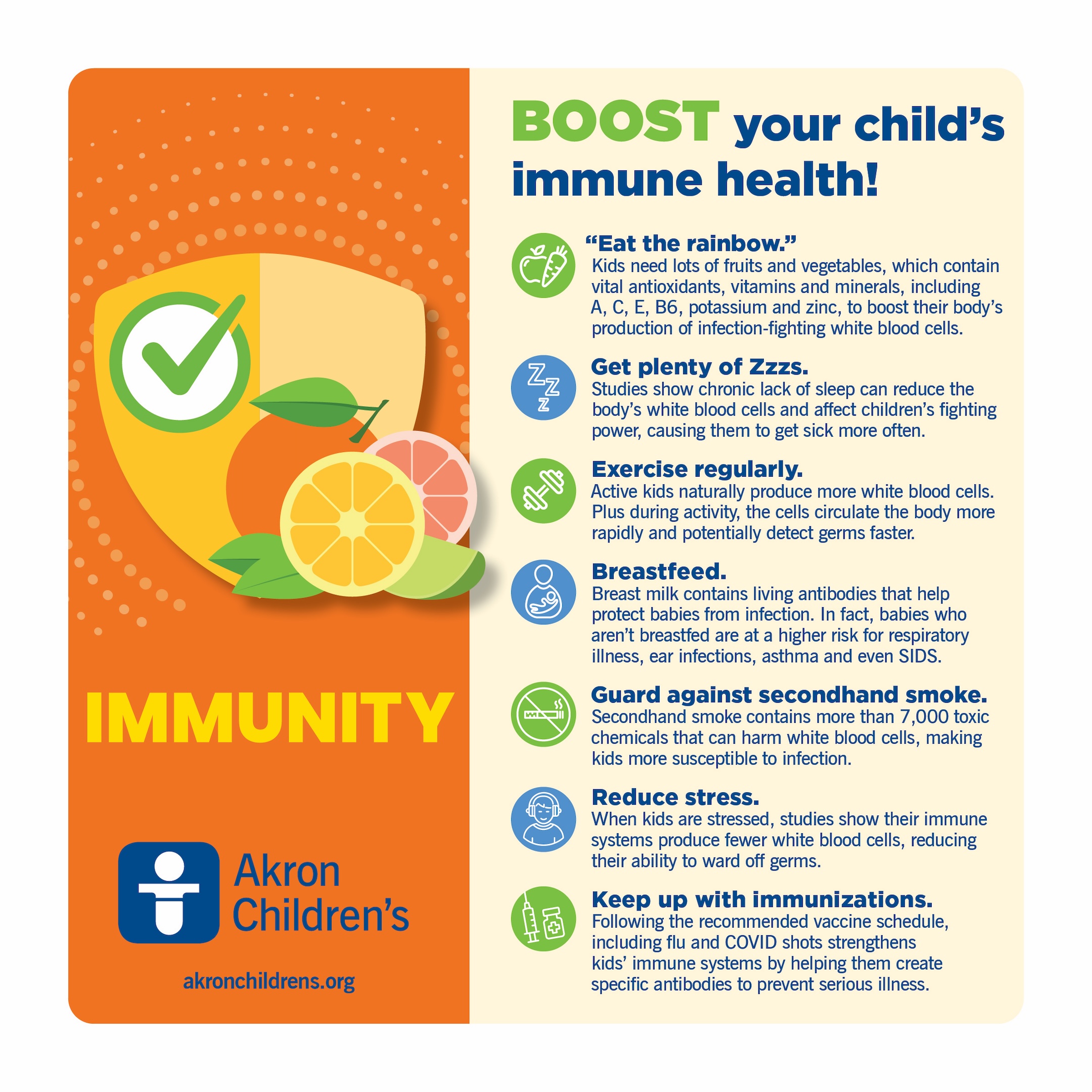 Eating a balanced diet rich in fruits and vegetables, regular physical activity and good sleep habits are important to keep the immune system strong. Vaccines like the flu shot also are helpful in boosting the immune system because they train your child’s immune system to recognize these harmful germs without experiencing the actual illness.