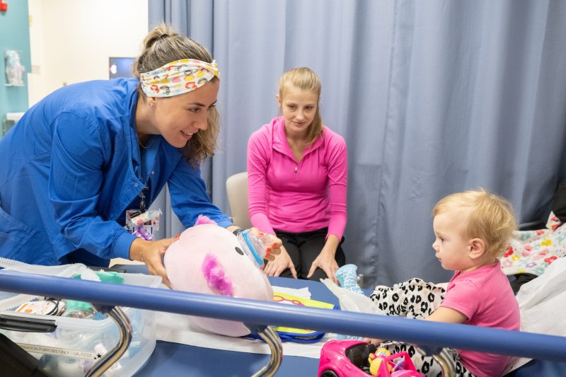 Lauren Armstrong, a child life specialist at Akron Children’s Outpatient Surgery Center, Beachwood, uses medical play to help children throughout their surgical procedure.