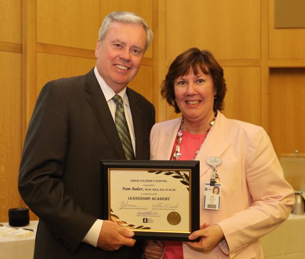 Pam at the Leadership Academy Graduation in 2014, with Bill Considine [former Akron Children’s president and CEO and former CEO emeritus].