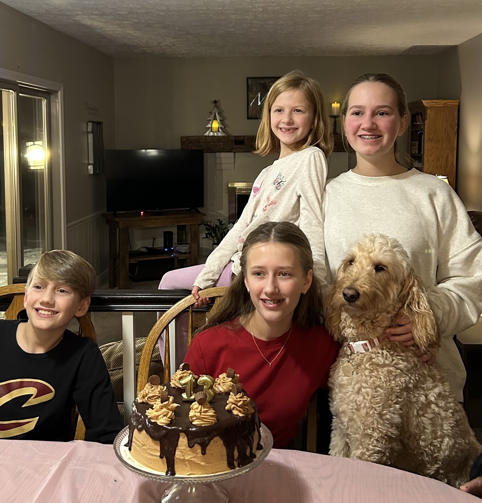 Jane’s sisters; brother, Trey; and dog, Belle; gather for a photo before digging into Jane’s birthday cake.