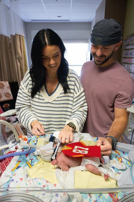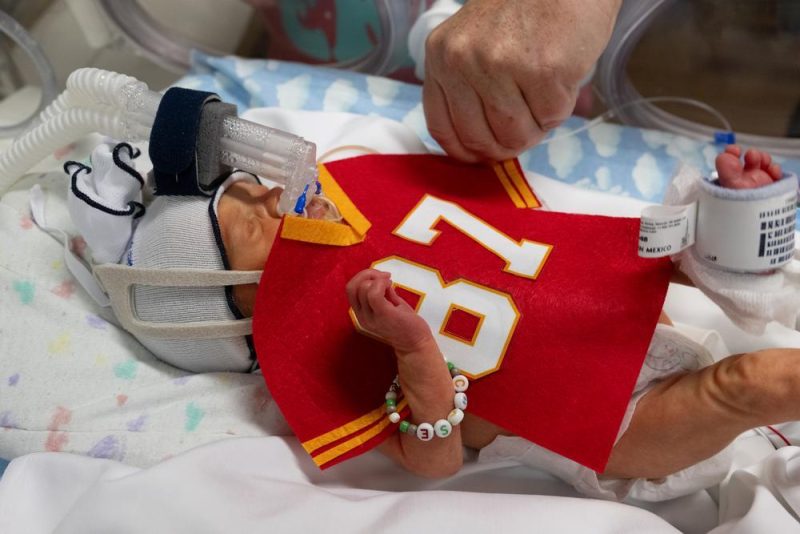 4-day-old Chase wears a Travis Kelce jersey and a personalized friendship bracelet with his name.