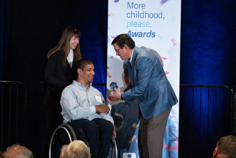 Casey and Lisa accept the Akron Children’s More childhood, please. Civic Champion Award from Akron Children’s CEO Chris Gessner.