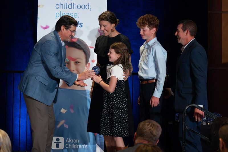 Jeff, Meagen, Emma and Owen Gries accept the Family Impact Award at Akron Children’s More childhood, please.™ Awards.