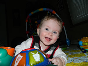 Jordan has been doing well with his super boots. I am amazed at how these boots have given him freedom. As Randy and I were getting ready to go to work last week, Jordan was playing in his little area and tipped over.