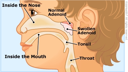 The adenoids are a patch of tissue in the back of the throat behind the nose. Their job is to help keep you healthy by trapping harmful bacteria and viruses that you breathe in or swallow.