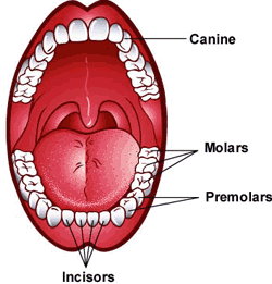 The pointy teeth beside your incisors are called canine (say: KAY-nine) teeth. There are four of them, two on top and two on bottom. Because these teeth are pointy and also sharp, they help tear food.