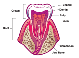 Cementum (say: sih-MEN-tum) makes up the root of the tooth, which is anchored to the jawbone.