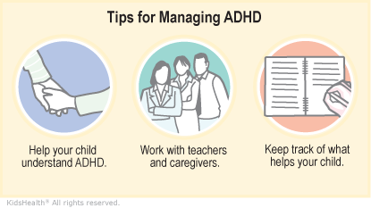 - Encourage your child to eat healthy food, get enough sleep, be active every day, and practice deep breathing. These things may help manage ADHD symptoms.