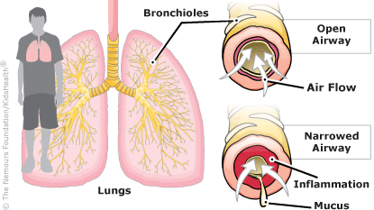 In asthma, the airways are always a little inflamed (irritated and swollen), even when a person has no symptoms. They’re also quick to react to certain things (“triggers”) that make them get even more inflamed, swollen, and filled with mucus, blocking the flow of air. The muscles around the airways tighten, making them even narrower, which makes it very hard to breathe. When this happens, it is called an asthma flare-up or asthma attack.
