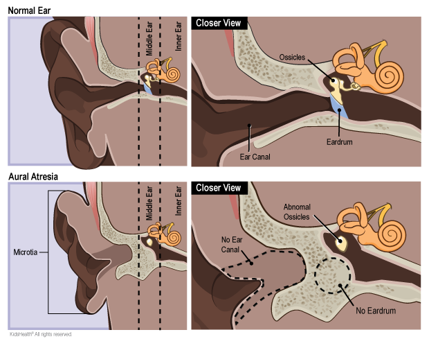 Aural atresia is when a baby is born without an ear canal. The baby's eardrum either didn't form normally or is missing. There also are problems with the middle ear bones (called ossicles). The parts of the inner ear, including the auditory (hearing) nerve, are usually normal. Most babies with aural atresia also have microtia (a small, misshapen outside part of the ear).