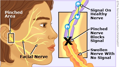 With Bell's palsy, one of the facial nerves swells and gets compressed as it passes through a small hole at the base of the skull. The compressed nerve can't send messages correctly, resulting in weakness or temporary paralysis on one side of the face.