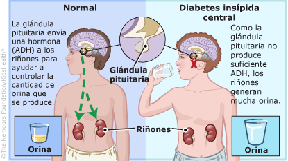 Without enough ADH, the kidneys can't keep enough water in the body. As a result, people with central diabetes insipidus lose too much water in their urine (pee). They may pee often and in large amounts, get up in the night to drink or pee, wet the bed, feel thirsty a lot, or become dehydrated.