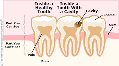 Cavities (also called caries) happen when bacteria (germs) and food left on the teeth after eating are not brushed or flossed away. The bacteria make acid that softens the tooth's outer hard surface (called the enamel). Once this happens, the acids can cause decay deeper in the tooth. This can lead to a cavity that sometimes causes tooth pain or sensitivity.