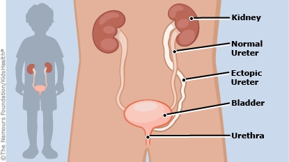 An ectopic ureter may run from the kidney to the urethra (the tube that carries urine from the bottom of the bladder to the outside of the body when a person pees) or the reproductive organs. In girls, an ectopic ureter may drain into the vagina.