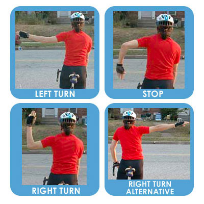 It's important for kids to know the arm signals for changing direction or turning. Make sure they know to never change directions or lanes without first looking behind them, and to always use the correct signals.