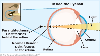 Farsightedness happens when light that enters the eyes doesn’t bend as it should. Instead of focusing directly on the retina, the light focuses behind the retina.