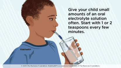 - Give your child small amounts of an oral electrolyte solution often. If your child throws up, start with small sips, about 1 or 2 teaspoons every few minutes.
