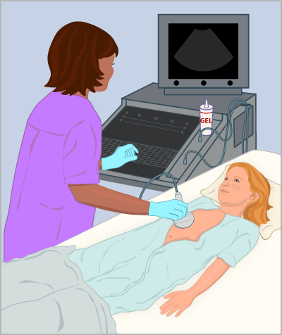 A technician (sonographer) trained in ultrasound imaging first spreads a clear, warm gel on the area to be scanned. This gel helps with the transmission of the sound waves. Then, they use a small transducer (or wand) that sends high-frequency sound waves into the body. The sound waves move through the body until stopped by something, such as bone or fluid. Then they echo back. A computer measures how they echo back, and changes the sound waves into images to be analyzed.