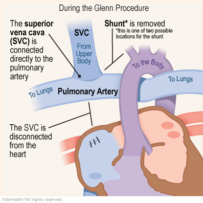 During the Glenn procedure, the surgeon disconnects the superior vena cava (SVC) from the heart and connects it to the pulmonary artery. Now the blood from the upper part of the body flows directly into the pulmonary artery. The pulmonary artery takes the blood to the lungs.