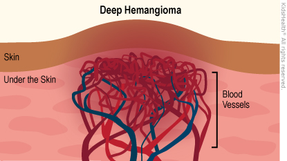 - Deep hemangiomas grow under the skin, making it bulge, often with a blue or purple tint. Deep hemangiomas are also called subcutaneous ("under the skin") hemangiomas.