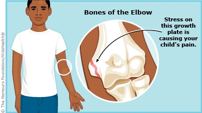 In Little League elbow, repeated throwing injures a growth plate in the elbow. A growth plate is a layer of cartilage near the end of a bone where most of the bone's growth happens. It's weaker and more at risk for injury than the rest of the bone.