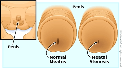 Meatal stenosis happens when irritation causes a scar at the meatus. This makes the opening smaller. Irritation can come from rubbing against a diaper, an injury to the penis, or having a catheter (a plastic tube that lets the pee flow out of the body) in place for a long time. Meatal stenosis is more likely to happen in a boy who is circumcised.