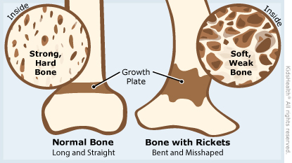 Vitamin D helps the body absorb calcium and phosphorus from food. Without enough vitamin D, the body can't keep enough calcium and phosphorus in the growth plates. Bones stay soft and weak, and can bend or have an odd shape.