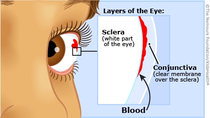 The white of the eye (the sclera) is covered by the conjunctiva (kon-junk-TYE-vuh), clear tissue that has many tiny blood vessels. The blood vessels can break and leak blood when the eye is injured or someone has a quick spike in blood pressure. The blood collects between the conjunctiva and the sclera (SKLAIR-uh), leaving a bright red spot on the eye’s surface.